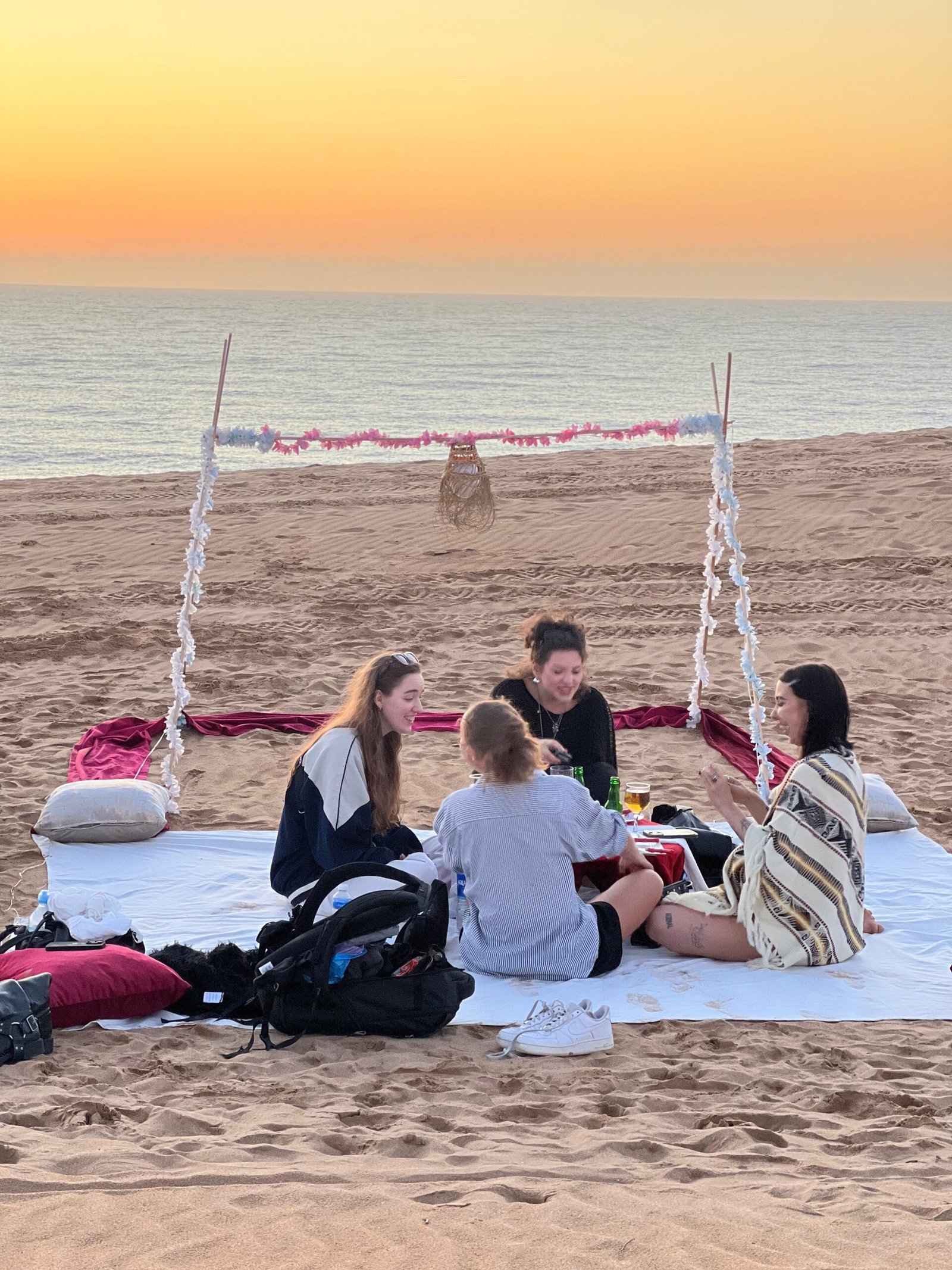 As the sun starts to set, we gather around. Fire, Moroccan tea, snacks, music. The sky turns orange, and suddenly you feel like you’re in a movie.